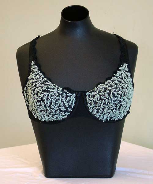 Adrienne Johns – Florescent Ant Guiperre This bra was made by Adrienne Johns for her exhibition Le Salon. This model is higher up the social set. Not ants in her pants but ants on her bra. (This is a "see in the dark" garment as the ants are stitched from luminous thread) |