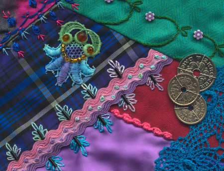 A detail of a crazy quilted frame for a notice board to hold photographs and memorabilia completed in 2004.
