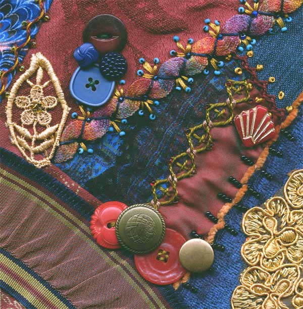 if you are interested in combinations of stitches for seam embellishments on crazy quilting projects you might also enjoy some of the links under crazy quilting in the side bar and Crazy quilt Seam treatments which are diagrams for seam embellishments and as a reference you can use the Stitch Dictionary. You may enjoy another crazy quilt I am working on here . There are also other Crazy quilting projects on the site as well.